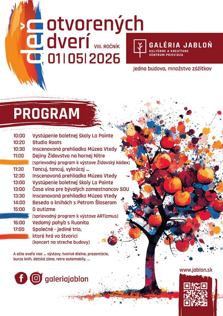 Galéria Jabloň vás pozýva na VIII. ročník Dňa otvorených dverí, ktorý sa uskutoční tradične 1. mája 2026 od 10:00 do 17:00 hod. Čaká Vás pestrý program plný umenia, hudby a kreativity: