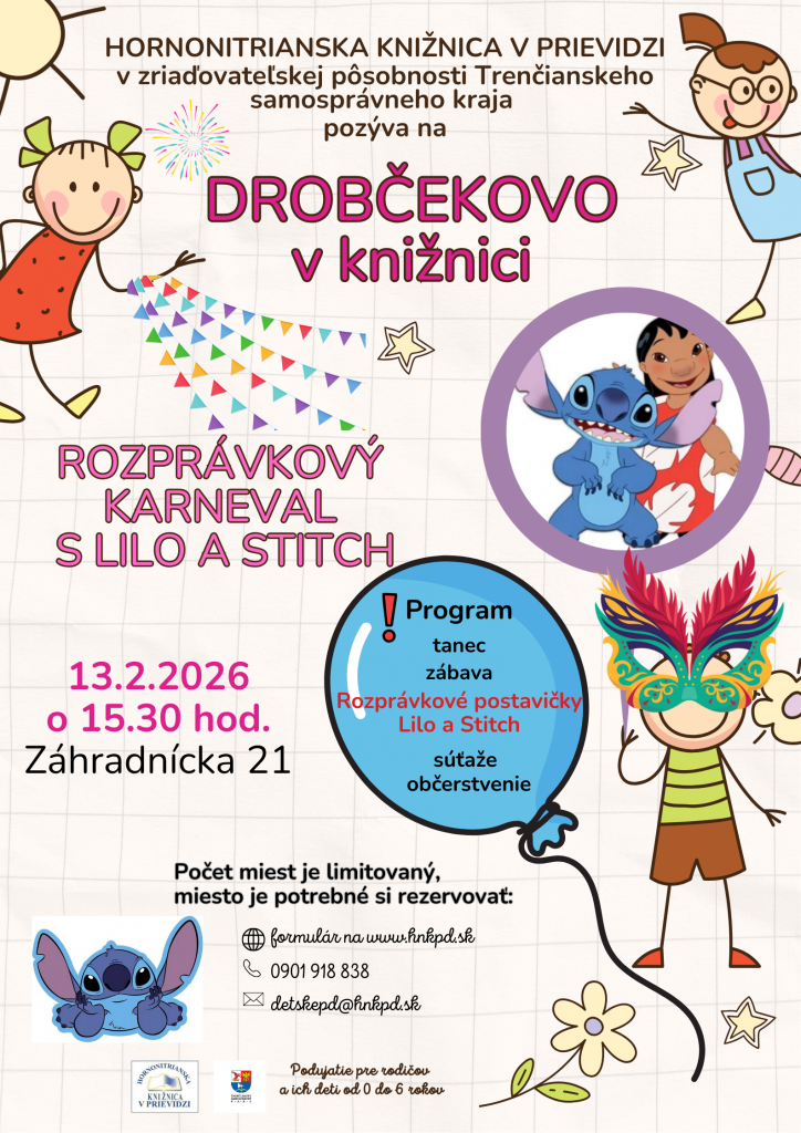 Milí rodičia a naši najmenší čitatelia, pozývame vás na veselý karneval v knižnici s postavičkami Lilo a Stitch, ktorý sa uskutoční v rámci podujatia Drobčekovo v Hornonitrianskej knižnici na Záhradníckej 21 dňa 13.2.2026 o 15.30hod.