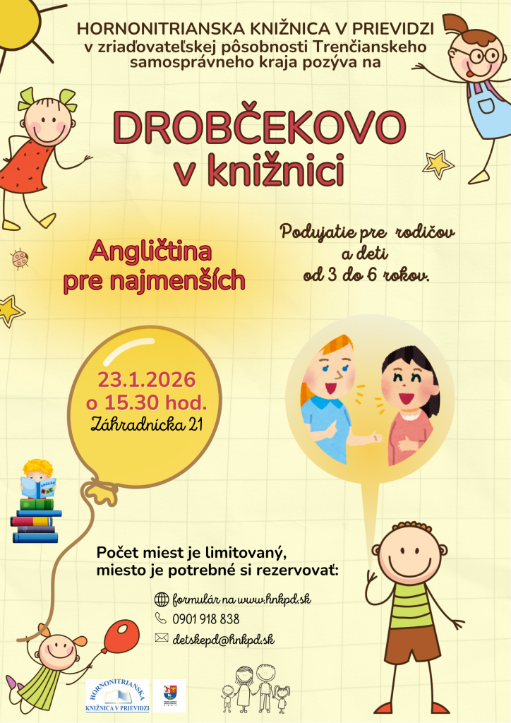 Práve preto sme si v januári pre našich najmenších čitateľov pripravili možnosť stretnúť sa s cudzím jazykom u nás v knižnici. V piatok 23. januára 2026 o 15:30 hod. sa deti vo veku 3 až 6 rokov spolu so svojimi rodičmi môžu hravou formou oboznámiť so slovnou zásobou týkajúcou sa rodiny. Čakajú na nich pesničky, hry a aktivity, ktoré im angličtinu priblížia zábavným spôsobom.