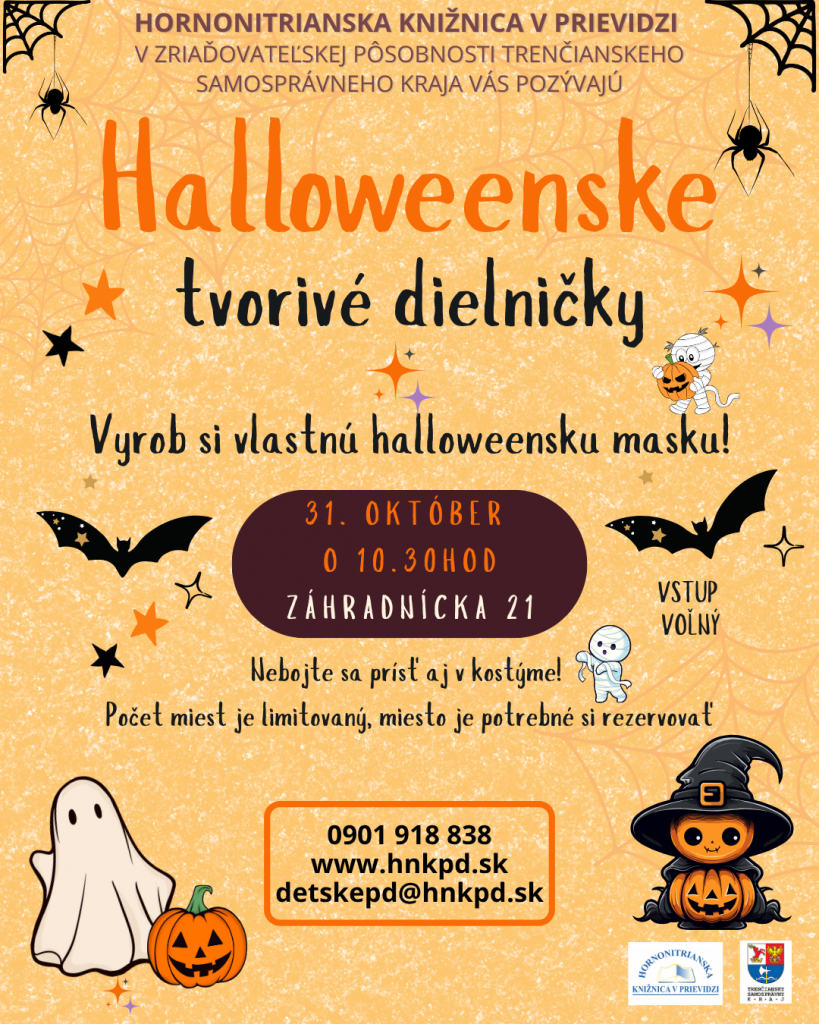 Hornonitrianska knižnica v Prievidzi pozýva všetky deti a ich rodičov na halloweenske tvorivé dielničky, ktoré sa uskutočnia 31. októbra o 10.30 hod. v priestoroch Hornonitrianskej knižnice na Záhradníckej ulici 21. v Prievidzi.
