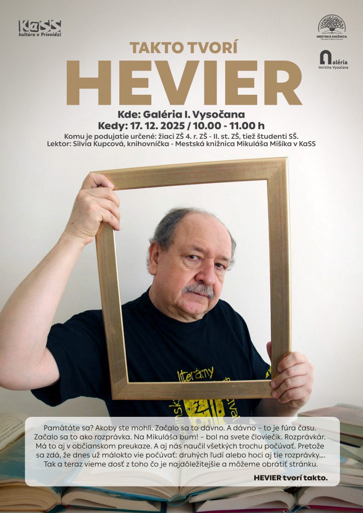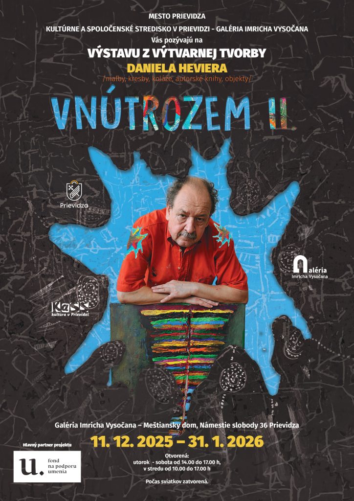 Prievidza sa v decembri stane mestom, kde sa tvorivosť Daniela Heviera prejaví v celej svojej šírke – literárnej, hudobnej aj výtvarnej. Pri príležitosti jeho životného jubilea sa uskutočnia tri výnimočné podujatia, ktoré ukážu rôzne podoby jeho talentu: autorský večer Daniel Hevier Tour 70, výstava Vnútrozem II. v Galérii Imricha Vysočana a tvorivé stretnutie pre žiakov Takto tvorí Hevier. Spoločne vytvoria pestrú mozaiku návratov známeho spisovateľa, textára, hudobníka a výtvarníka do mesta jeho detstva.
