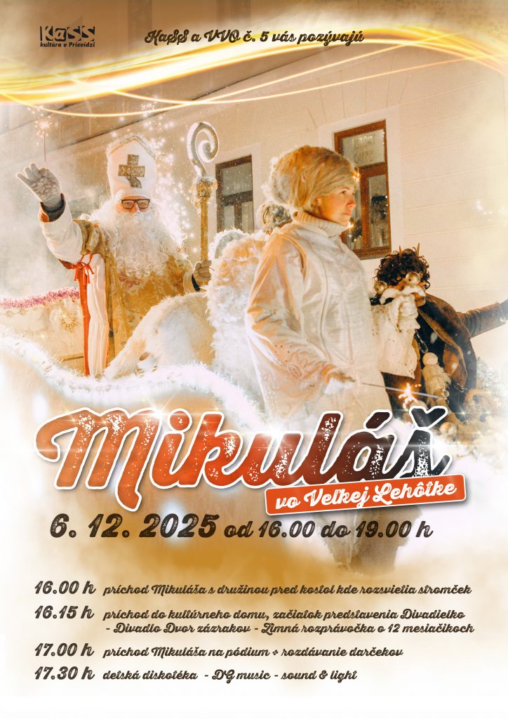 Kultúrne a spoločenské stredisko mesta Prievidza (KaSS) v spolupráci s Výborom volebného obvodu č. 5 Veľká Lehôtka srdečne pozývajú všetky deti i dospelých na mikulášske popoludnie, ktoré sa uskutoční v sobotu 6. decembra 2025 od 16.00 do 19.00 h vo Veľkej Lehôtke.