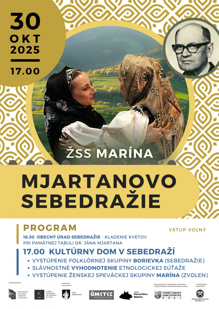 Pozývame Vás na slávnostné vyhodnotenie celoslovenskej etnologickej súťaže MJARTANOVO SEBEDRAŽIE, ktoré sa uskutoční vo štvrtok 30. 10. 2025 o 17.00 h v Kultúrnom dome v Sebedraží. Vstup voľný.