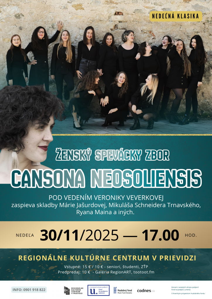 Srdečne Vás pozývame na koncert ženského akademického speváckeho zboru Cansona Neosoliensis, ktorý sa uskutoční dňa 30. novembra 2025 o 17.00 h v Regionálnom kultúrnom centre v Prievidzi.