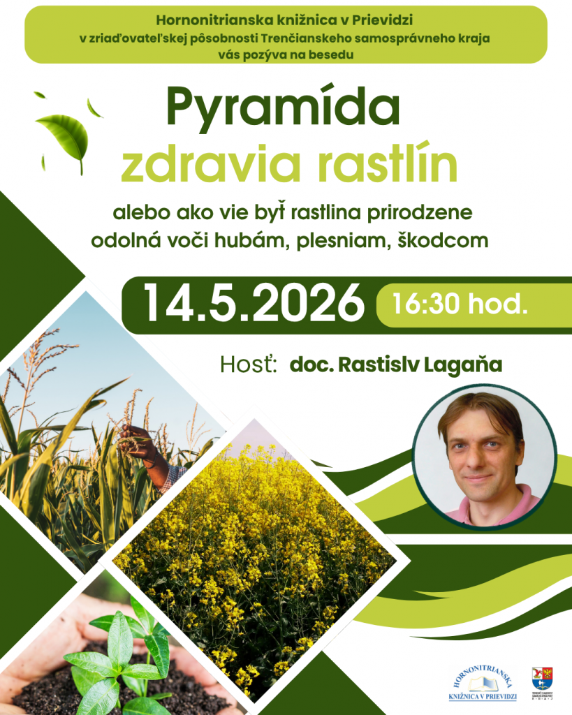 Hornonitrianska knižnica v Prievidzi na Záhradníckej 21 v spolupráci s občianskym združením Život a zdravie vás pozývana inšpiratívnu besedu Pyramída zdravia rastlín alebo ako vie byť rastlina prirodzene odolná voči hubám, plesniam, škodcom. Ponúkne nám nový pohľad na pestovanie v súlade s prírodou. 14.5.2026 o 16.30 hod. sa dozviete, ako vytvoriť podmienky, v ktorých rastliny prosperujú bez potreby nadmerného používania chemických prípravkov, a ako podporiť ich prirodzenú obranyschopnosť.