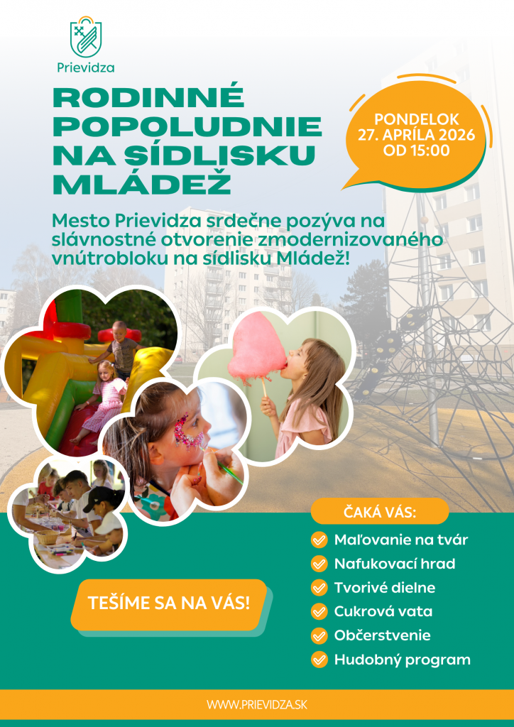 Mesto Prievidza pozýva obyvateľov na príjemné komunitné podujatie pri príležitosti otvorenia zrevitalizovaného vnútrobloku na sídlisku Mládež, ktoré sa uskutoční v pondelok 27. apríla od 15:00.
