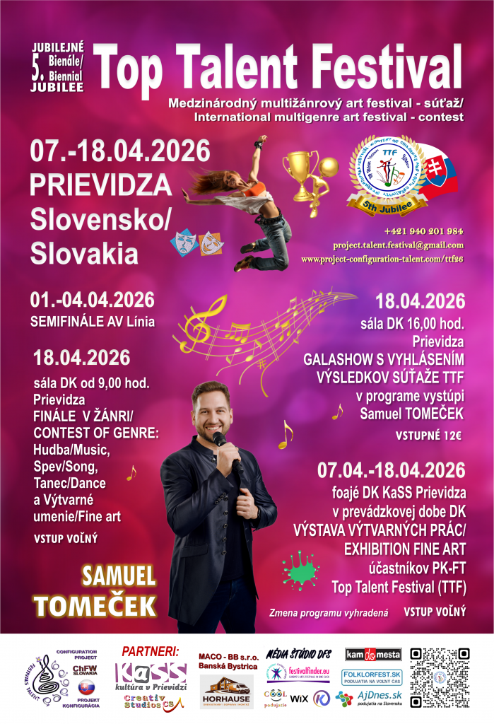 18.04.2026 – FINÁLE Súťaž v žánroch HUDBA, SPEV, TANEC, DIVADLO a VÝTVARNÉ UMENIE cca od 9 hod. DK KaSS Prievidza, v prípade potreby posun priamo do Galashow