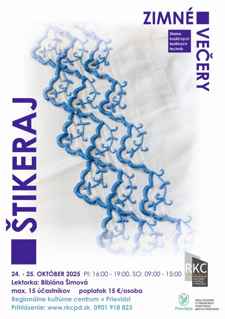 Dvojdňová dielňa tradičnej textilnej techniky. Štikeraj je nárečový výraz pre výšivku na leme spodnej sukne (vábničky), spodnej košele, šiat či na lemoch vankúšov a perín. Štikeraj sa vyšíva plným plochým stehom a obnitkovacím stehom (madeira, richelieu).