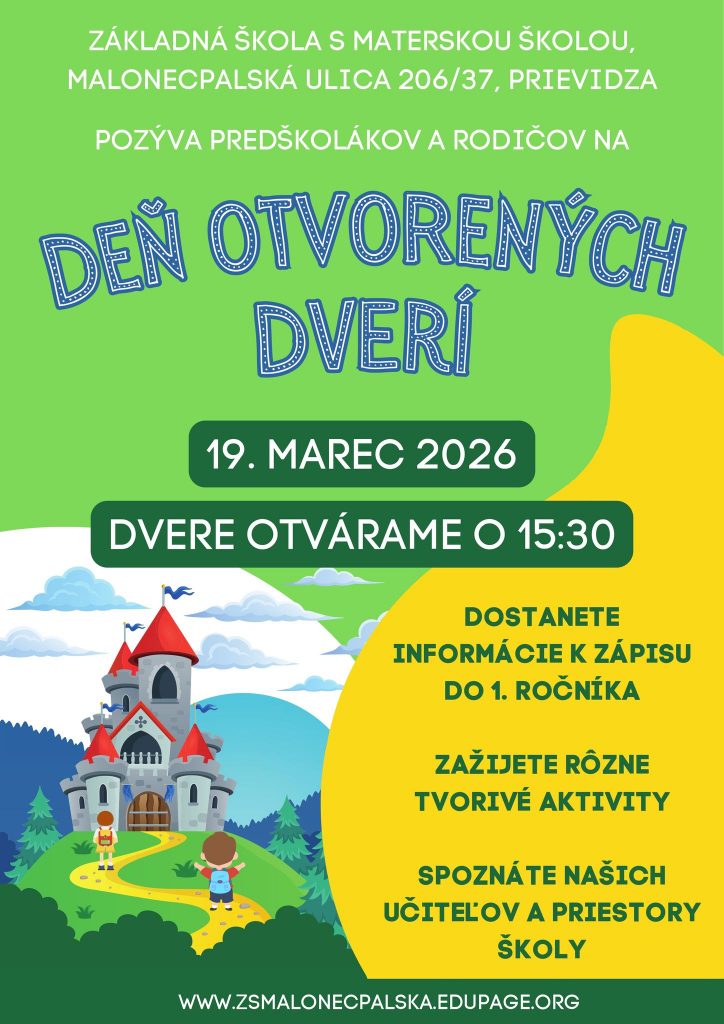 Základná škola s materskou školou, Malonecpalská ulica v Prievidzi srdečne pozýva všetkých budúcich prváčikov a ich rodičov na Deň otvorených dverí, ktorý sa uskutoční vo štvrtok 19. marca 2026 o 15.30 hod.