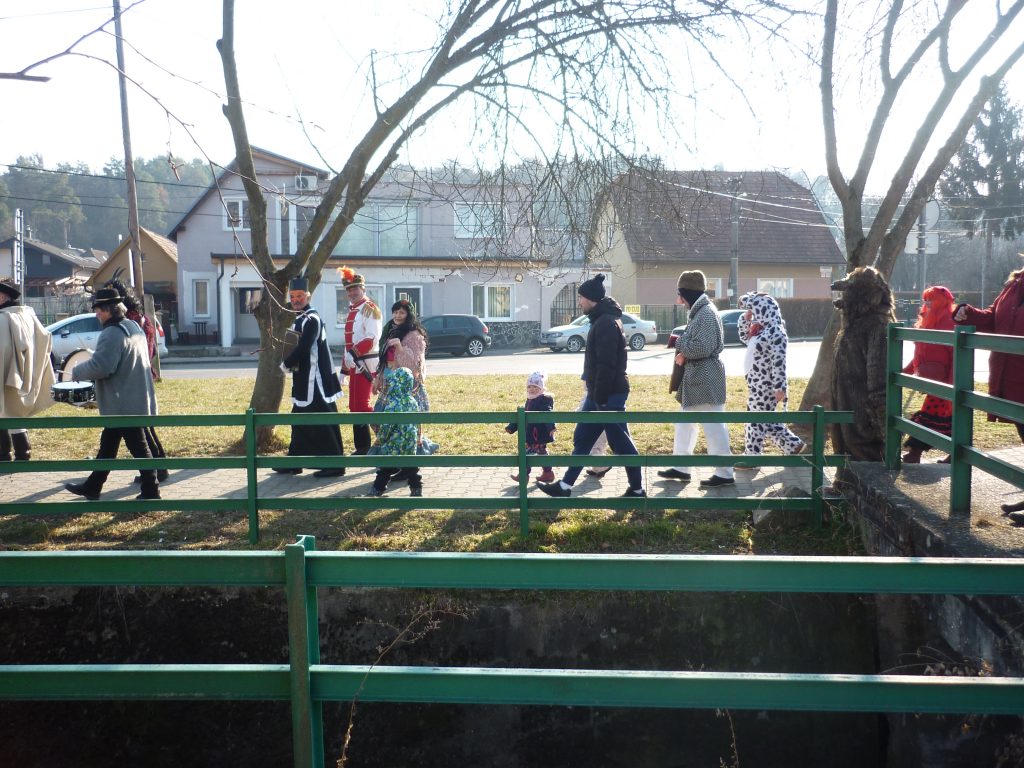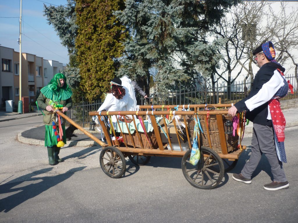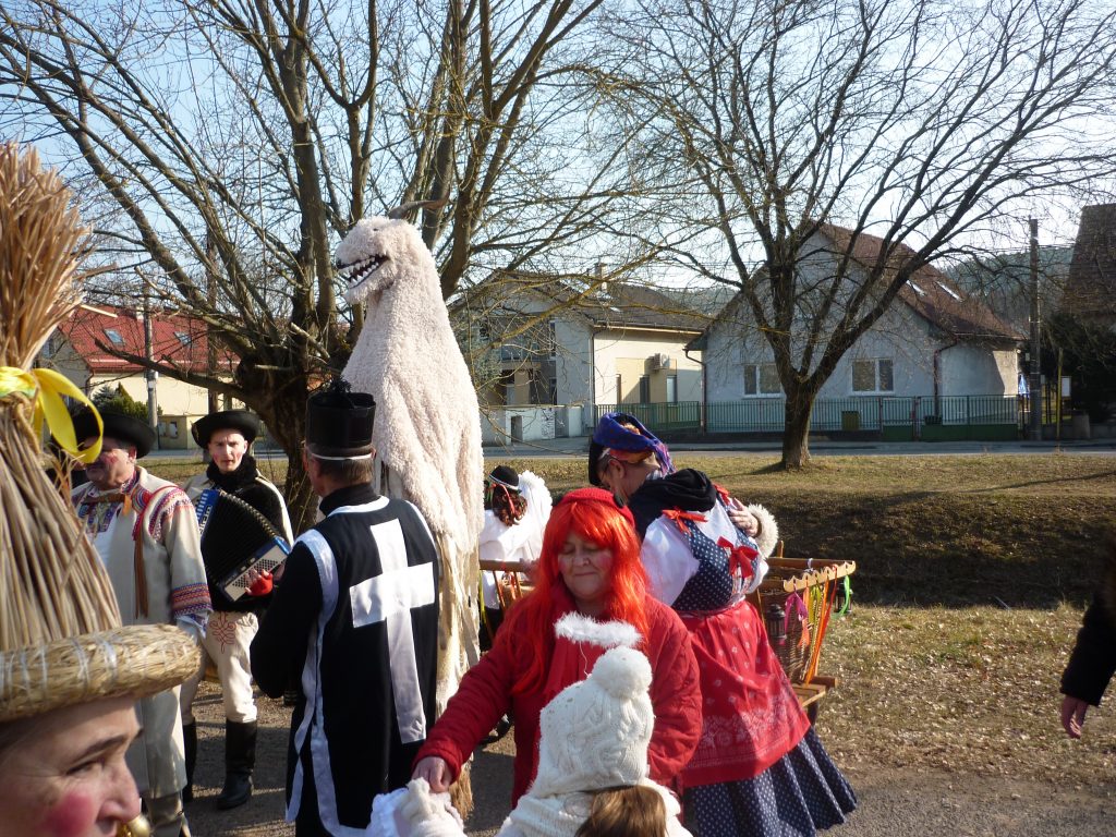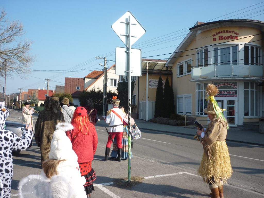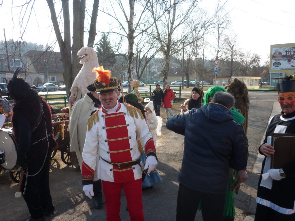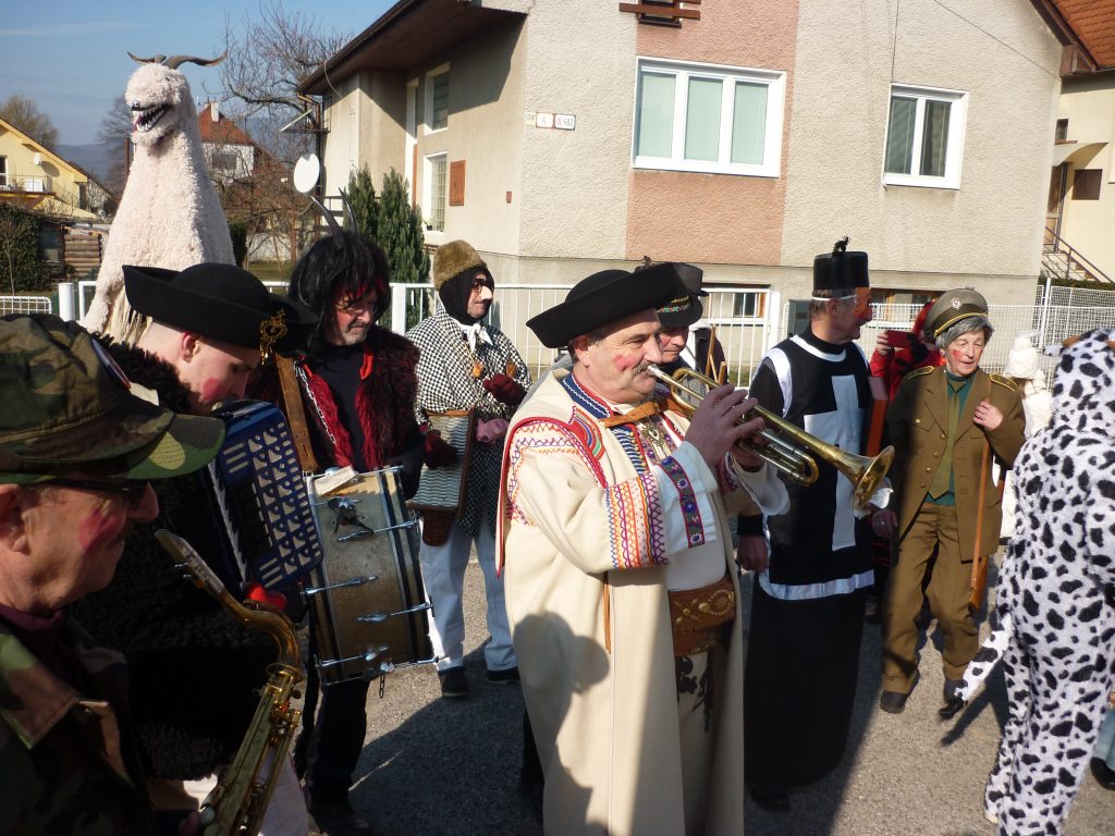V sprievode boli naši členovia: Mariana Vaňová – gazdiná, Marián Chlpek – gazda, Kvetoslava Ďurčová – slamák, Pavel Mokrý – farár, Bohumil Vaňo – mäsiar, Martin Jurík – kominár, Eva Nováková a Mária Mokrá – cigánky, Jolana Jankulárová – policajt, Božena Šovčíková – karkulka, Jana Nechalová – lienka. Ešte boli v sprievode – vodník, krava, polmužpolžena, husár, čert, medved, turoň, muzikanti, anjelik. „A tam hore na komore, sedí kocúr na slanine. Choďteže ho odohnať a nám kúsok odrezať. Režte, režte, len sa neporežte, ak sa máte porezať, pôjdeme si sami odrezať…..“