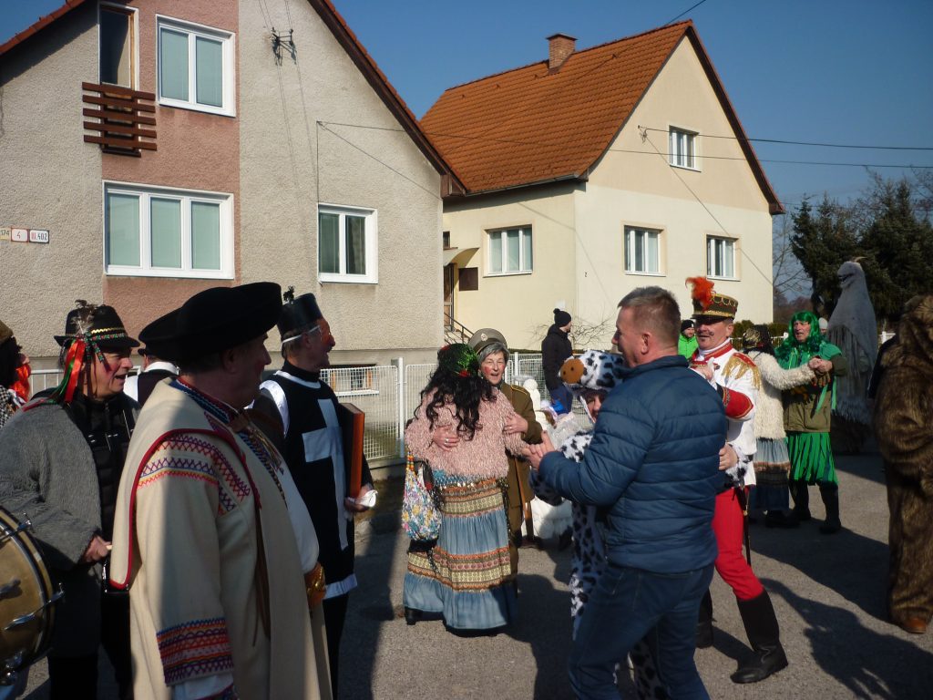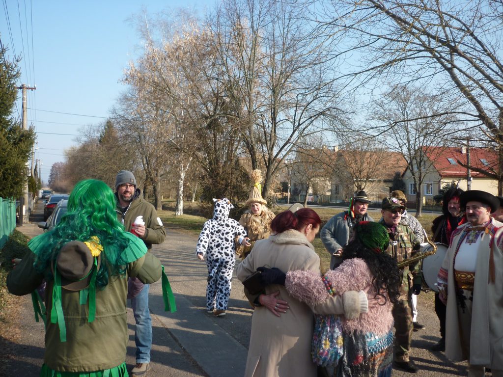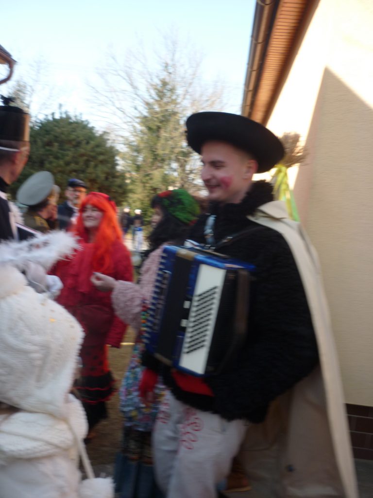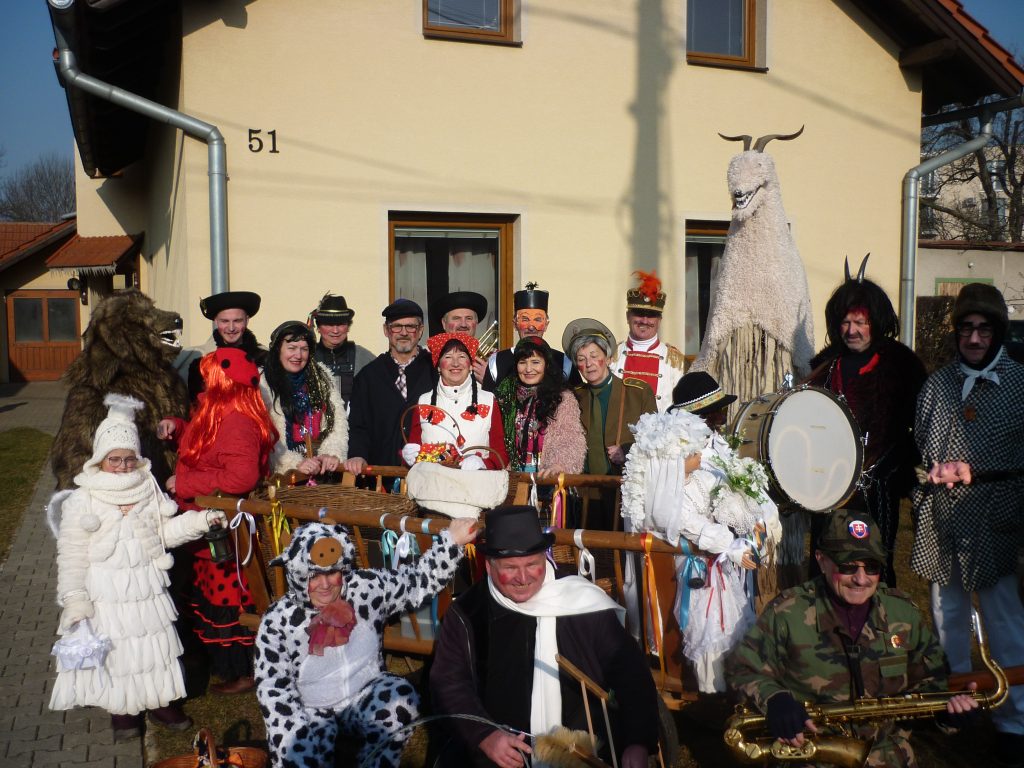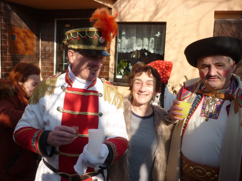 V sprievode boli naši členovia: Mariana Vaňová – gazdiná, Marián Chlpek – gazda, Kvetoslava Ďurčová – slamák, Pavel Mokrý – farár, Bohumil Vaňo – mäsiar, Martin Jurík – kominár, Eva Nováková a Mária Mokrá – cigánky, Jolana Jankulárová – policajt, Božena Šovčíková – karkulka, Jana Nechalová – lienka. Ešte boli v sprievode – vodník, krava, polmužpolžena, husár, čert, medved, turoň, muzikanti, anjelik. „A tam hore na komore, sedí kocúr na slanine. Choďteže ho odohnať a nám kúsok odrezať. Režte, režte, len sa neporežte, ak sa máte porezať, pôjdeme si sami odrezať…..“