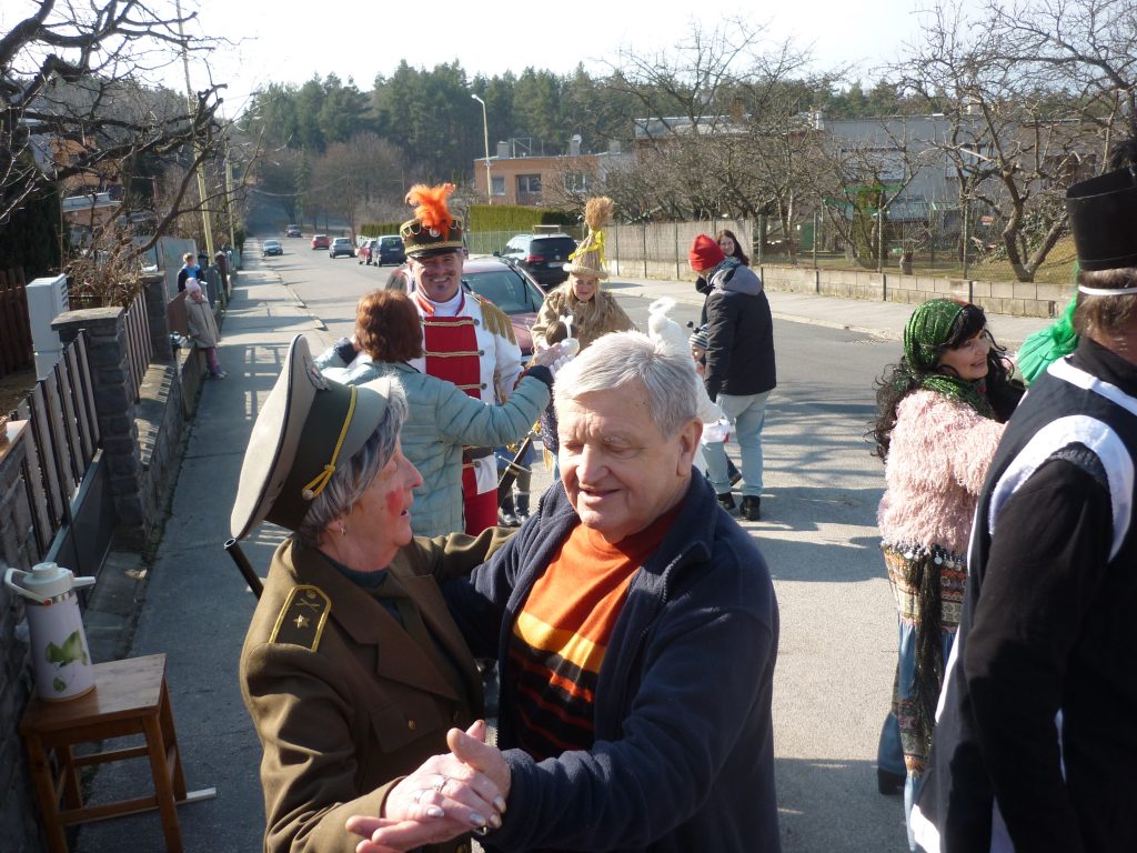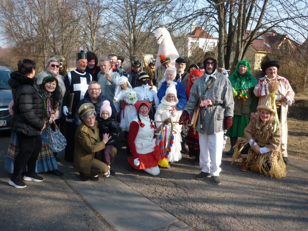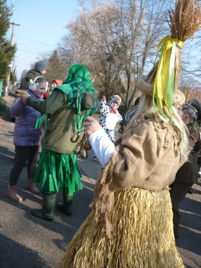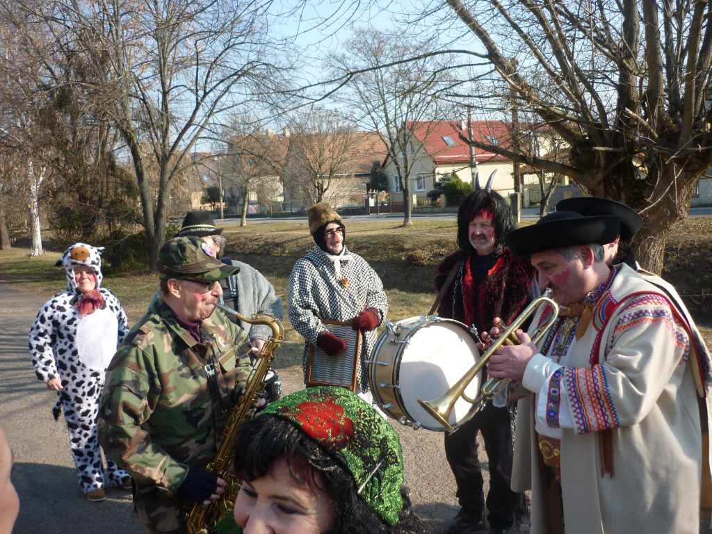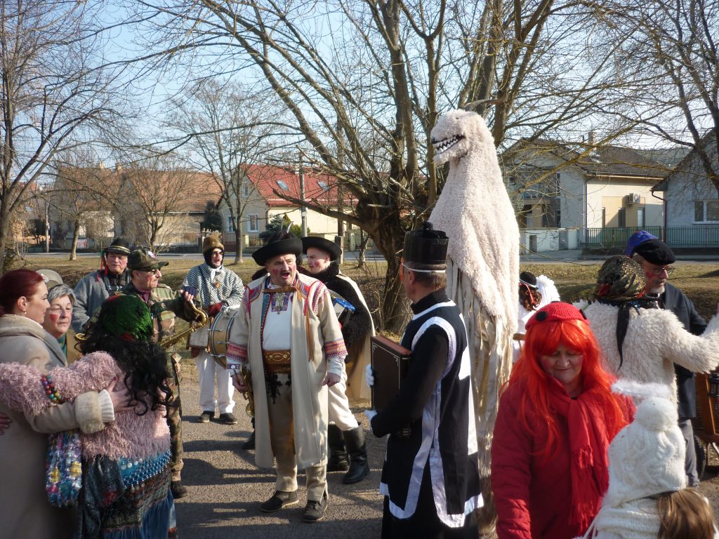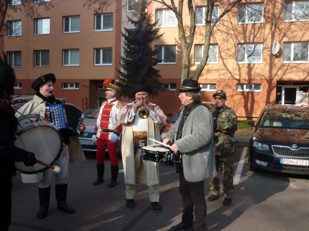 V sprievode boli naši členovia: Mariana Vaňová – gazdiná, Marián Chlpek – gazda, Kvetoslava Ďurčová – slamák, Pavel Mokrý – farár, Bohumil Vaňo – mäsiar, Martin Jurík – kominár, Eva Nováková a Mária Mokrá – cigánky, Jolana Jankulárová – policajt, Božena Šovčíková – karkulka, Jana Nechalová – lienka. Ešte boli v sprievode – vodník, krava, polmužpolžena, husár, čert, medved, turoň, muzikanti, anjelik. „A tam hore na komore, sedí kocúr na slanine. Choďteže ho odohnať a nám kúsok odrezať. Režte, režte, len sa neporežte, ak sa máte porezať, pôjdeme si sami odrezať…..“