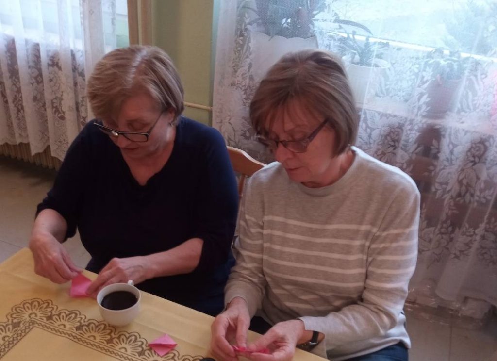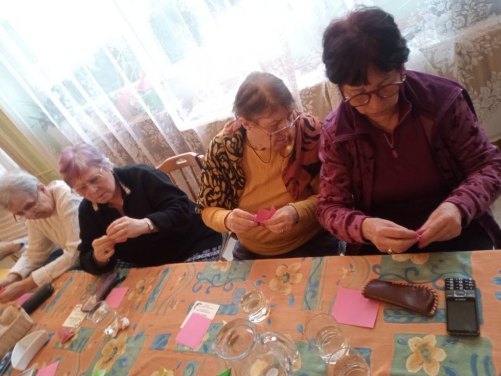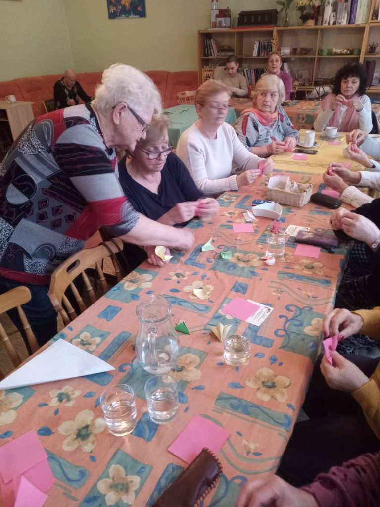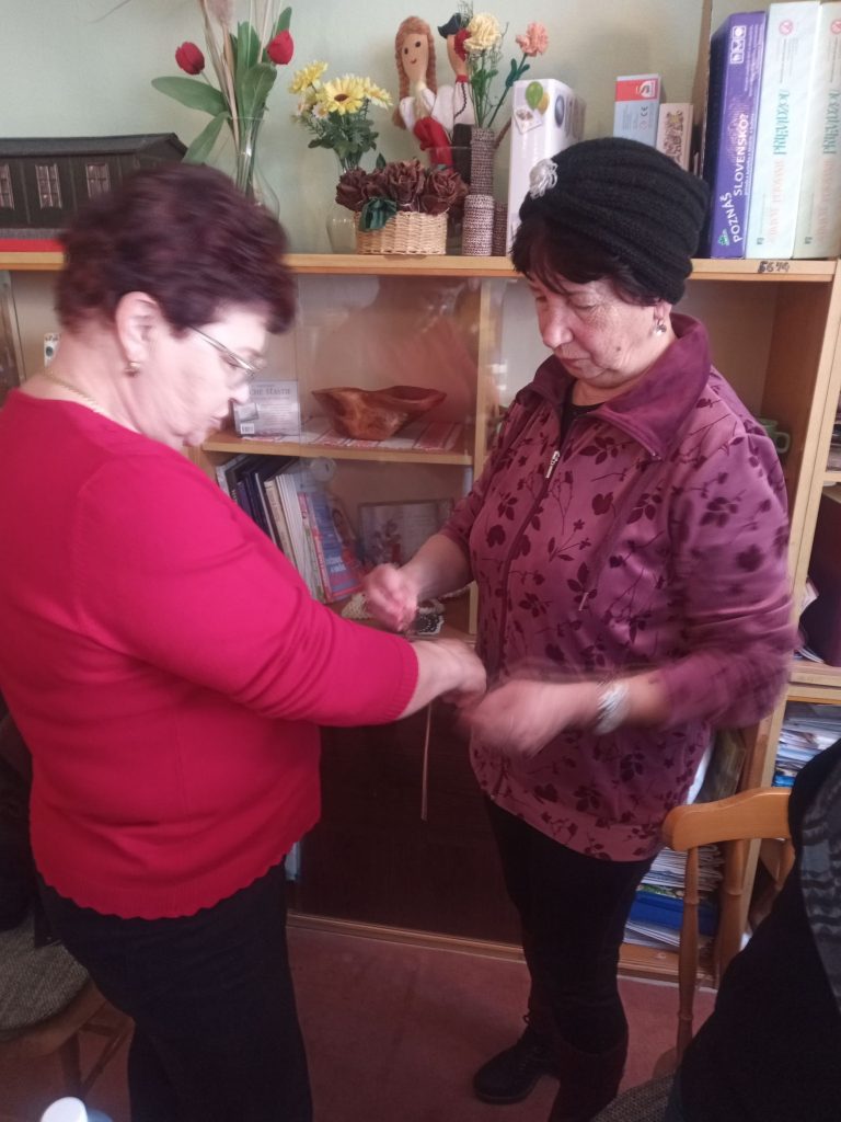 Na precvičenie manuálnych zručností nám poslúžili farebné papieriky na poznámky. Naša členka Anna Švarcová sa podujala, že nás naučí robiť z nich kvetinky. Mala s nami trpezlivosť aby sa nejaké podarili. A aj sa podarili. Niektorí zvolili pre svoju činnosť aj kartové hry a takto príjemne sme strávili popoludnie.