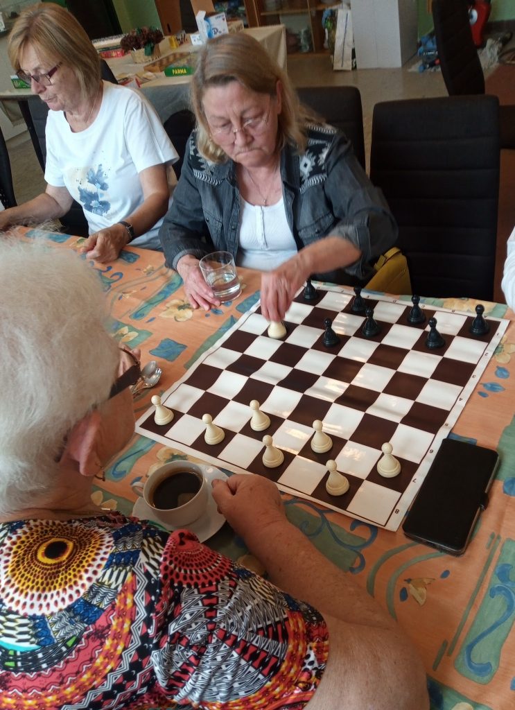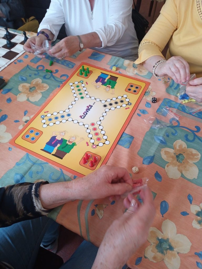 Hravú stredu sme pripravili pre našich členov. Precvičili sme si pravidlá hier, niektoré sme sa naučili, potrápili sme si mozgové závity, precvičili jemnú motoriku. Už vieme ako sa hrá Domino, klasické aj obrázkové Človeče, aké ťahy použiť pri Preskakovanej, väčšia skupina si zahrala Žoliky. Ako hrať a počítať Šipky, ako chytať Rybičky. Tvorivo bolo pri guličkových Puzzle, a nepochybne naviac smiechu bolo pri hre Veselý štamperlík s vodou. Vo veselej zábave sme strávili príjemné popoludnie.
