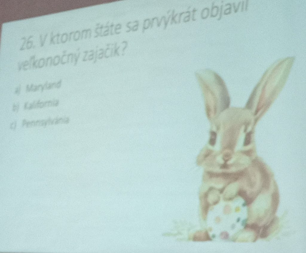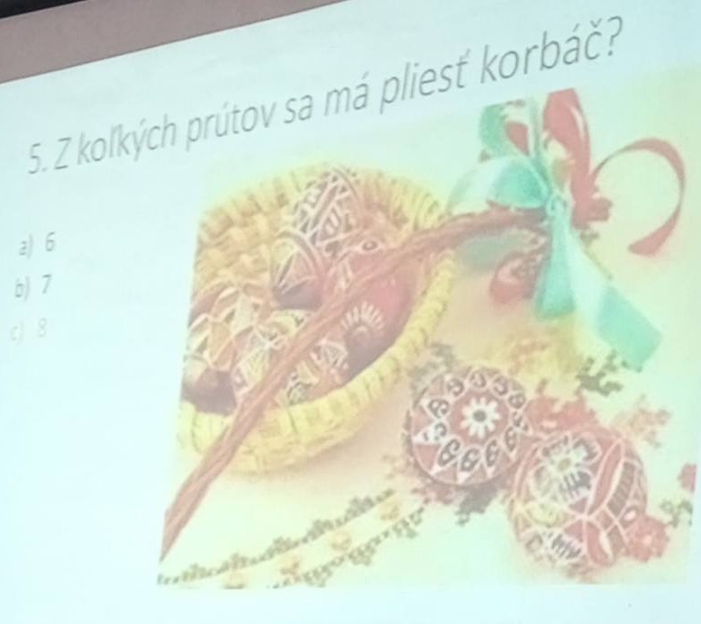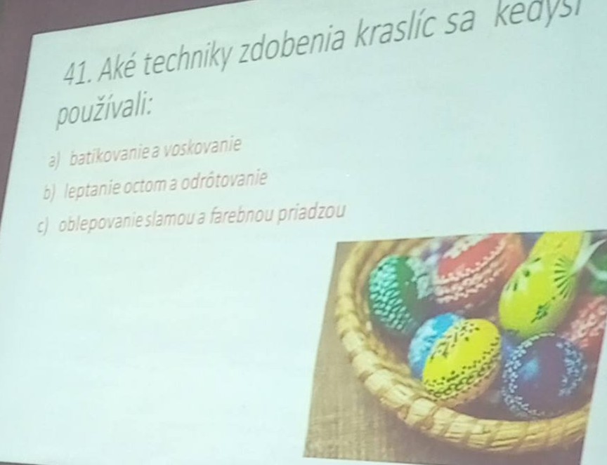 Prichádzajúcu jar sme si pripomenuli tradíciami, ktoré sme videli v zaujímavej prezentácii nielen zo Slovenska, ale aj zo sveta. A bolo tam veľa zaujímavého. Následne sme si svoje poznatky overili v kvíze o Veľkej noci. Aké sú symboly Veľkej noci, aké zvyky sa zachovávajú, aké osobitosti majú aj v iných krajinách – nesmie sa tancovať, vyhadzujú sa panvice z okna, púšťajú sa šarkany, hľadajú sa čokoládoví zajačikovia, prečo sa šibú dievčatá….. Boli to zaujímavosti, o ktorých sme ani netušili. Veľa kvízových otázok bolo zodpovedaných správne, aj sme zasmiali pri niektorých odpovediach. A veselo bolo aj pri veľkonočnom Páli vám to. Kvíz bol zaujímavý a tešíme sa na ďalší, ktorý nám kvízmajster pripraví. A na akú tému? Bude prekvapenie.