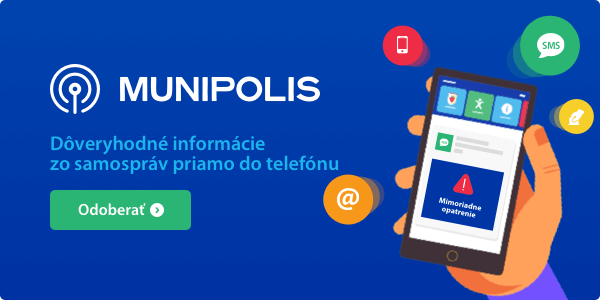 spustili sme pre vás službu MUNIPOLIS, vďaka ktorej vás teraz budeme efektívne informovať priamo do vášho telefónu. Prihláste sa k odberu a už nikdy nezmeškáte dôležité novinky a upozornenie z našej samosprávy. Informácie podľa vašich záujmov vám budeme posielať e-mailom, SMS alebo ako správu do aplikácie. Služba je zadarmo!
