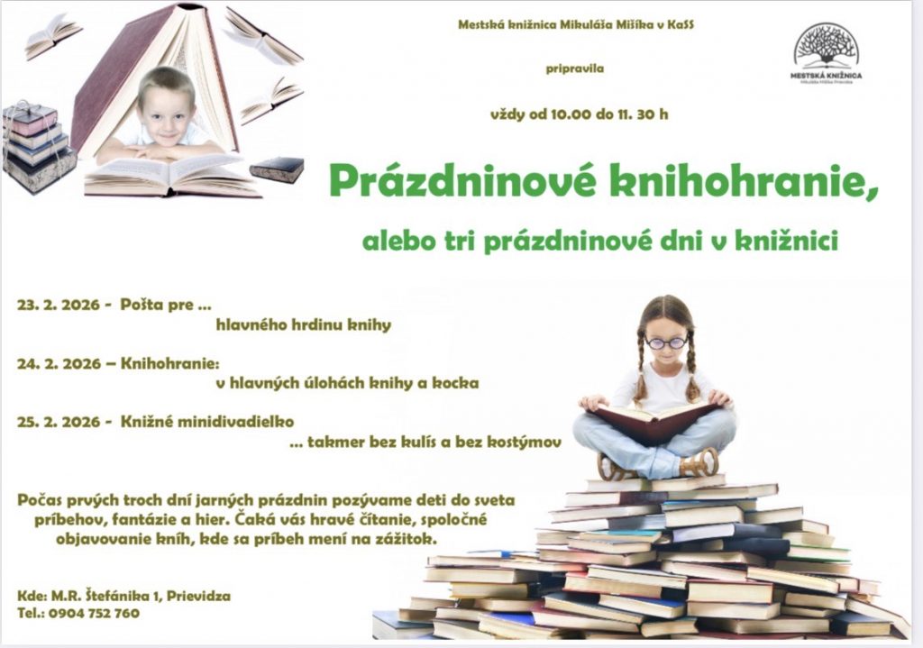 Pod názvom „Prázdninové knihohranie, alebo tri prázdninové dni v knižnici“ sa uskutočnia tri dopoludnia plné hravého čítania, jednoduchých tvorivých činností a zábavných úloh. Každý deň prinesie inú tému, ktorá vždy súvisí s knihou. Deti sa môžu tešiť na aktivity, ktoré podporujú predstavivosť, rozvíjajú tvorivosť a zároveň prirodzene vedú k radosti z čítania.