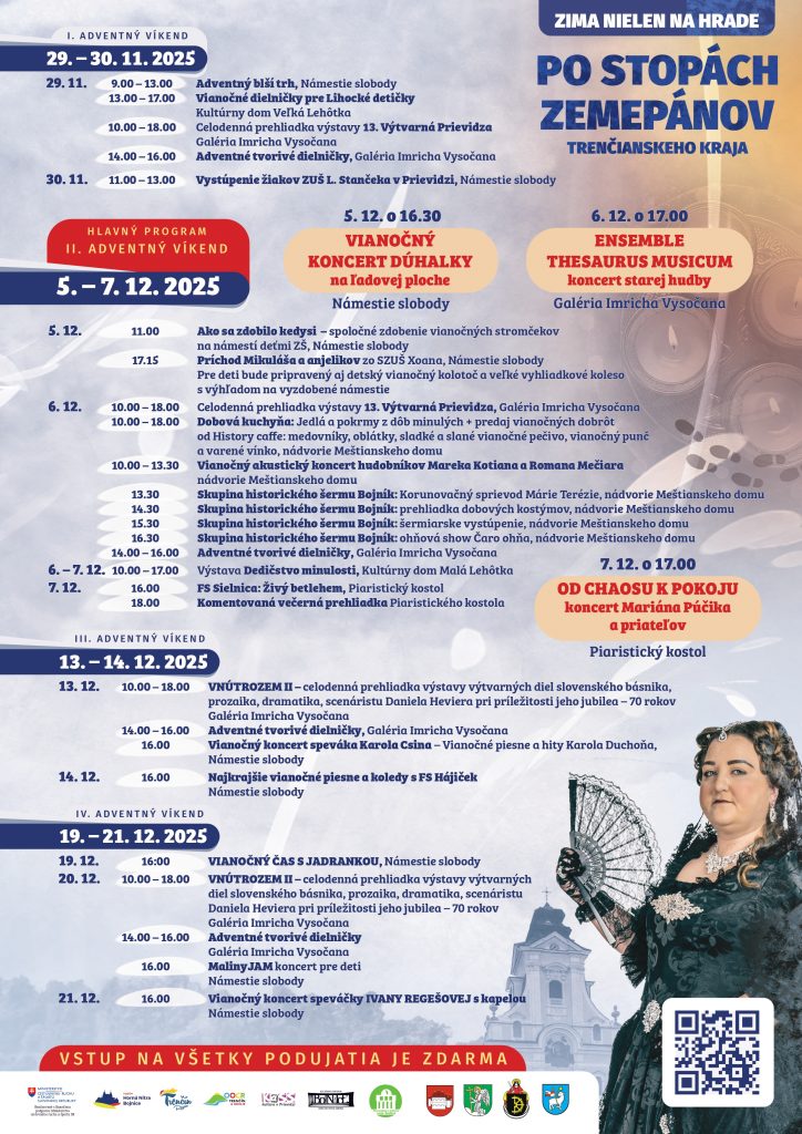 „Obyvatelia aj návštevníci sa skutočne majú na čo tešiť – prinášame bohatý, originálny a viacžánrový program, ktorý nebude trvať len jeden víkend, ale všetky štyri adventné víkendy. Mimoriadne sa tešíme, že práve počas druhého adventného víkendu, keď do mesta zavíta Mikuláš, bude Prievidza v rámci projektu Po stopách zemepánov Trenčianskeho kraja hostiteľom podujatí, ktoré ešte viac umocnia sviatočnú atmosféru nielen v meste, ale aj v regióne. Vstup na všetky podujatia je zdarma,“ priblížila vedúca kancelárie primátorky Diana Šurkalová Dušeková.