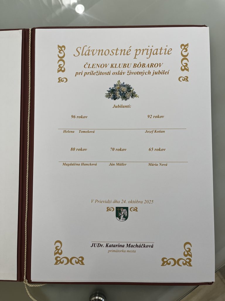 V obradnej sieni Mestského domu v Prievidzi sa dňa 20. októbra 2025 uskutočnilo slávnostné prijatie členov Klubu Bôbarov, ktorí v tomto roku oslávili krásne životné jubileá – 96, 92, 80, 70 a 65 rokov.