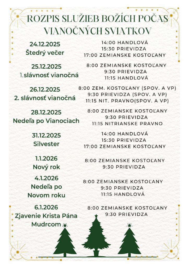 Počas tohtoročných Vianočných sviatkov prinášame veriacim prehľad slávenia bohoslužieb v jednotlivých farnostiach nášho regiónu. Verní si tak môžu jednoducho vybrať vhodný čas svätej omše na Štedrý večer, počas sviatočných dní či na začiatku nového roka. Rozpis zahŕňa bohoslužby v Prievidzi, Handlovej, Zemianskych Kostoľanoch a Nitrianskom Pravne.