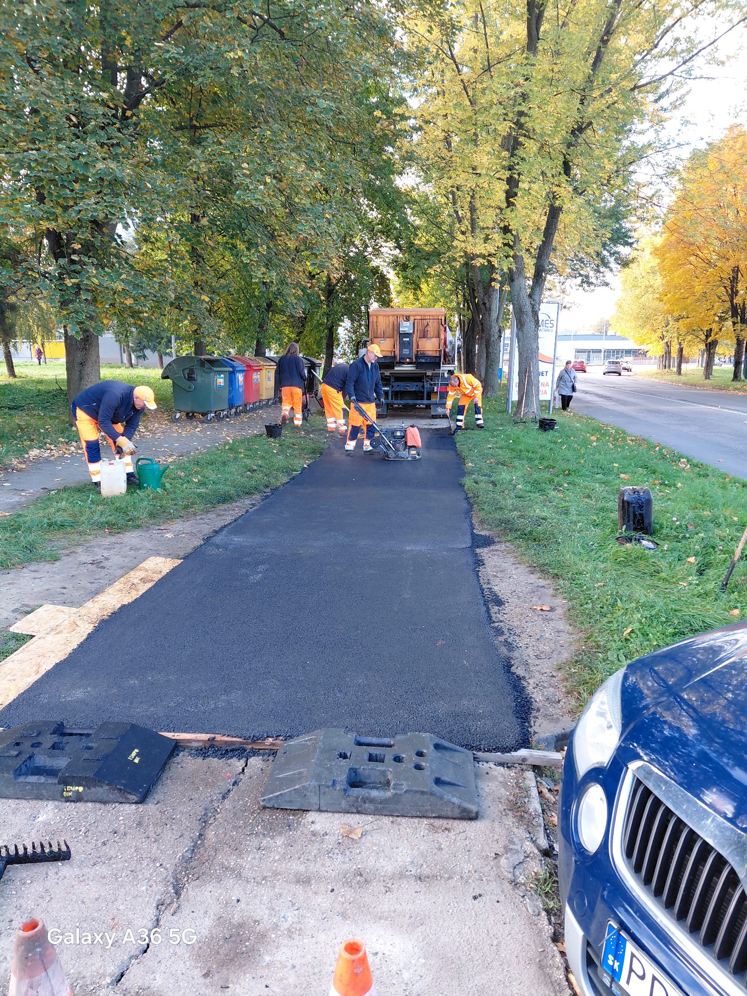 Ani jesenné počasie neodradilo pracovníkov v pokračovaní opráv miestnych komunikácií. Počas uplynulých dní asfaltovali chodník na Nábrežnej ulici, na Námestí slobody opravovali dlažbu a na cyklotrase stojiská.