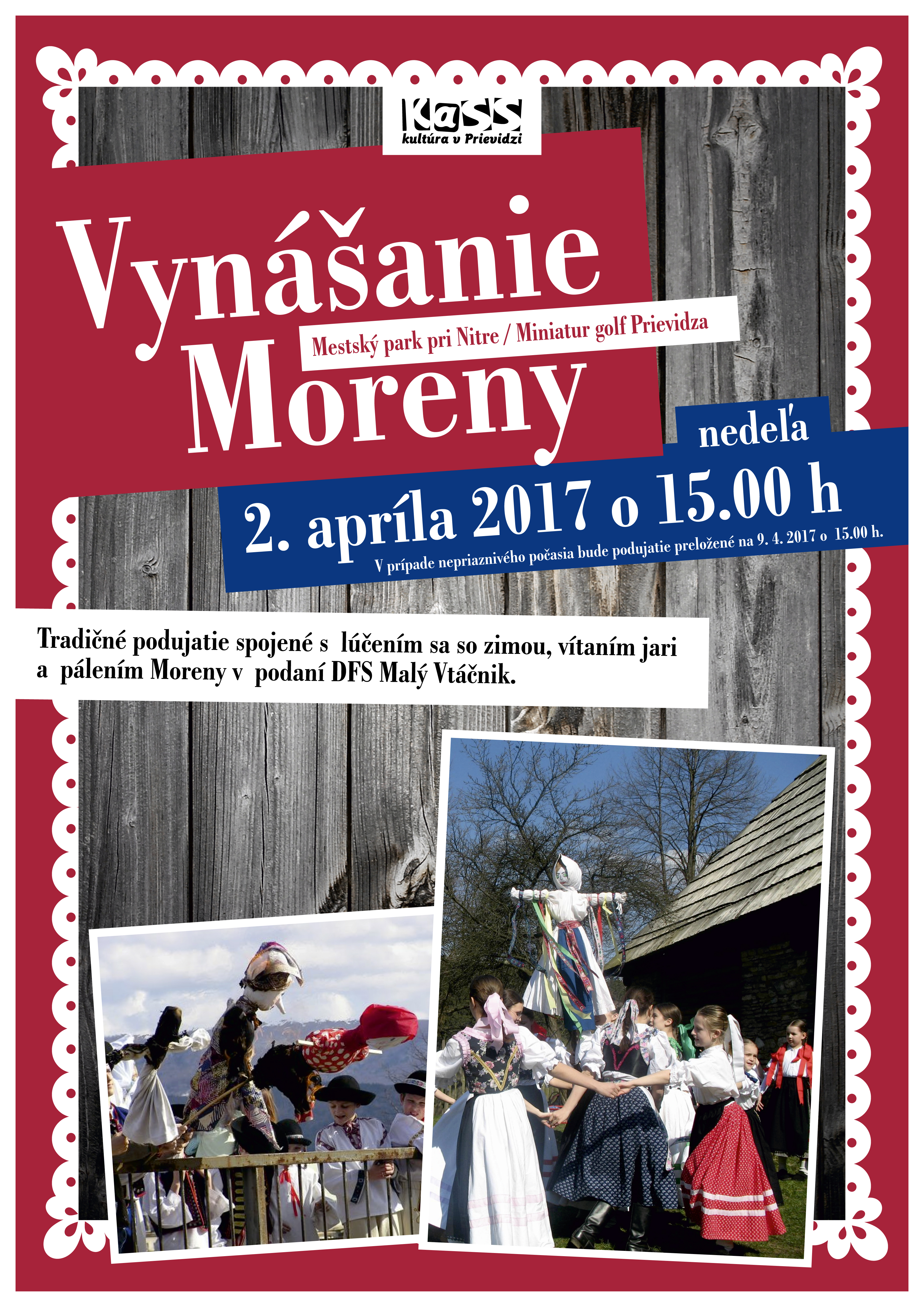 Zvyky spojené s lúčením sa so zimou, vítaním jari a pálením Moreny vám predstavia členovia folklórneho súboru DFS Malý Vtáčnik v nedeľu, 2. apríla 2017 o 15.00 h v Mestskom parku v rámci Minigolf Prievidza a neskôr na moste nad riekou Nitrou. V prípade nepriaznivého počasia bude podujatie preložené na nedeľu, 9. apríla 2017.